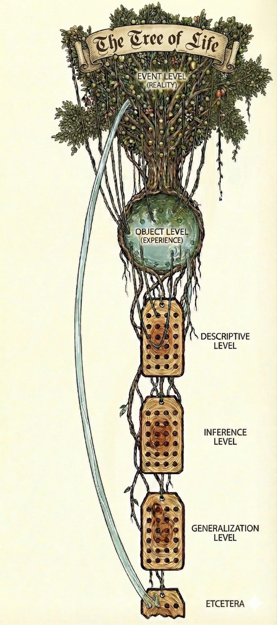The Structural Differential shows that the further we move from the Event Level (reality), the more detail we lose. At the Object Level, we miss parts of the chaos we can’t sense. At the Description Level, words strip away nuance. By the time we reach Inferences and Generalizations, we are working with a tiny, polished fraction of the full picture. This isn’t a flaw; it’s just how humans process the world. But it means we are always missing something.